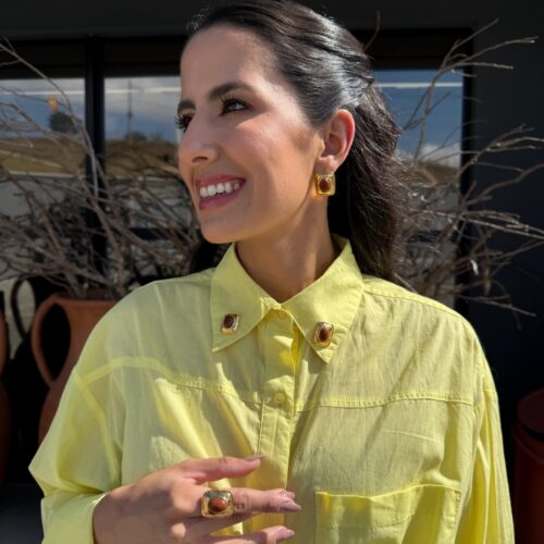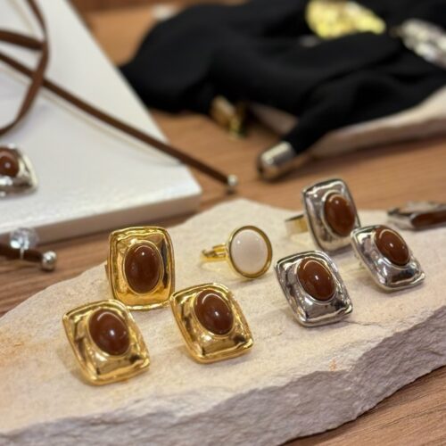 Anel pequeno regulável de formato retangular no banho de ouro e pedra de resina oval na cor marrom, super leve. *Consulte a aba “dicas de conservação” ou vide a etiqueta afixada ao produto para ciência sobre os cuidados com a peça.