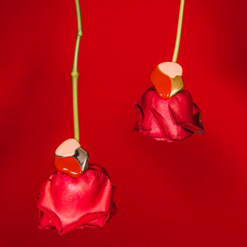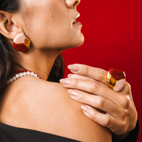 Anel grande regulável com formato orgânico no banho de ouro e esmaltação nas cores rosa e vinho. *Consulte a aba “dicas de conservação” ou vide a etiqueta afixada ao produto para ciência sobre os cuidados com a peça.