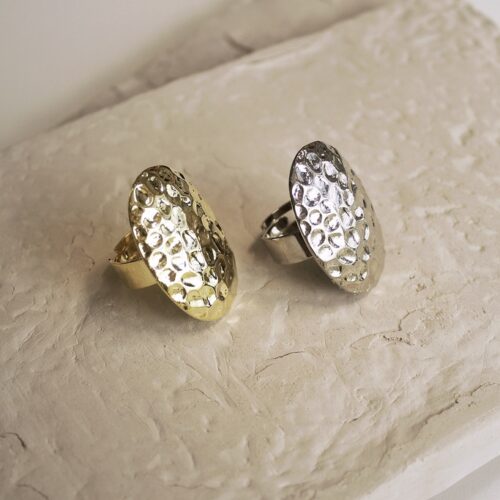 Anel oval grande no banho de ouro com texturas. Possui regulagem. *Consulte a aba “dicas de conservação” ou vide a etiqueta afixada ao produto para ciência sobre os cuidados com a peça