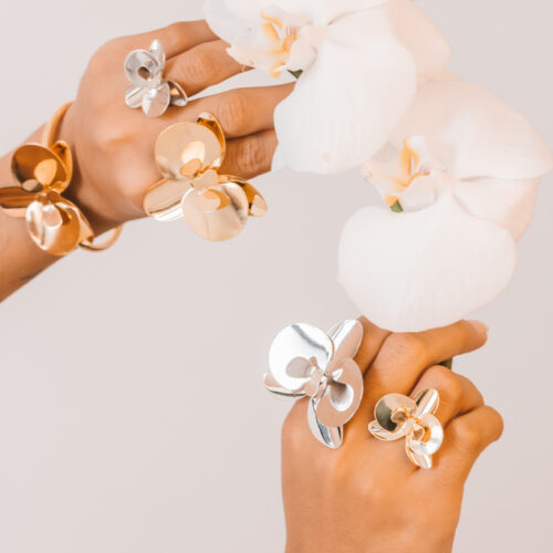 Anel regulável em banho de ouro e orquídea de tamanho grande.*Consulte a aba “dicas de conservação” ou vide a etiqueta afixada ao produto para ciência sobre os cuidados com a peça.