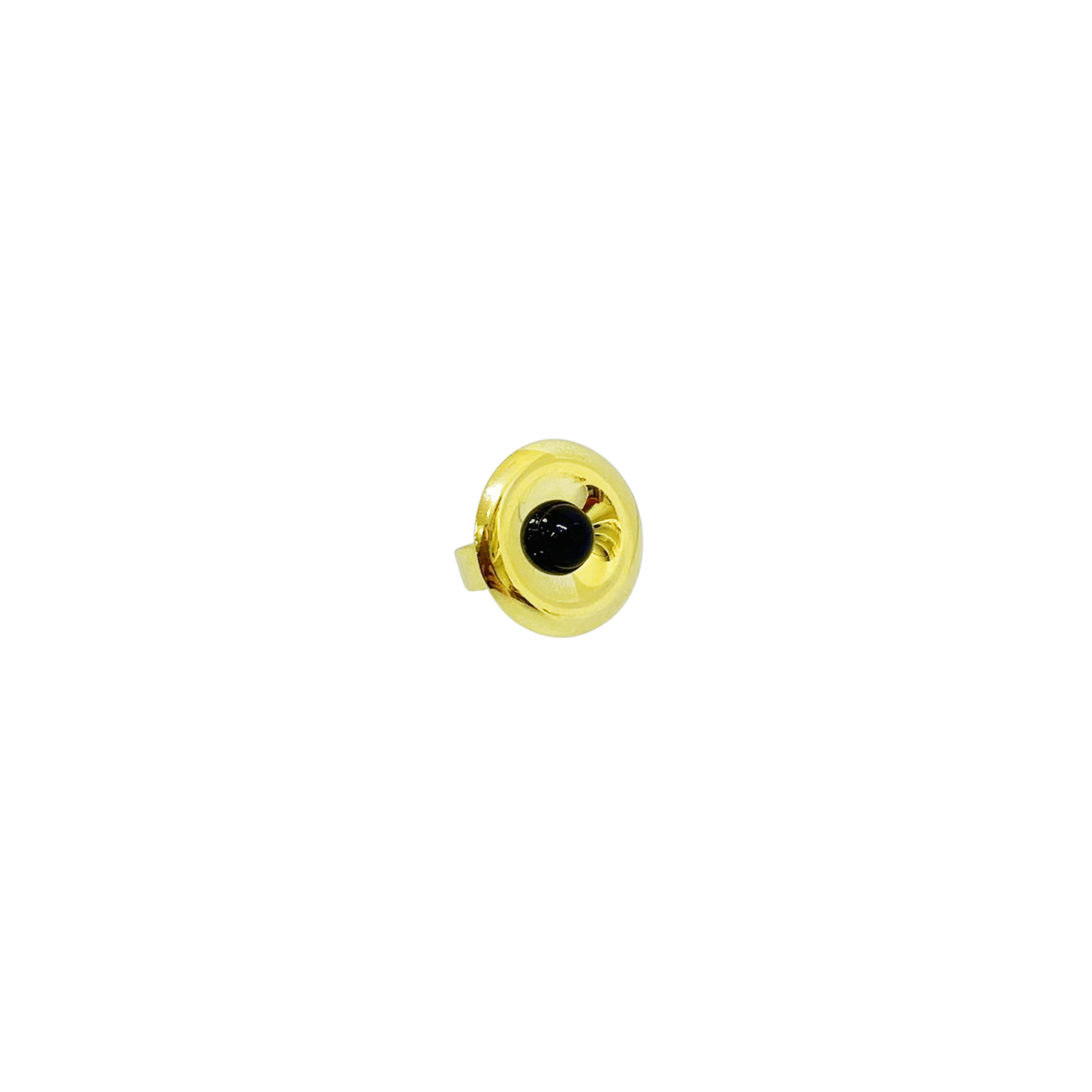 Anel médio redondo no banho de ouro e pedra acrílica preta.