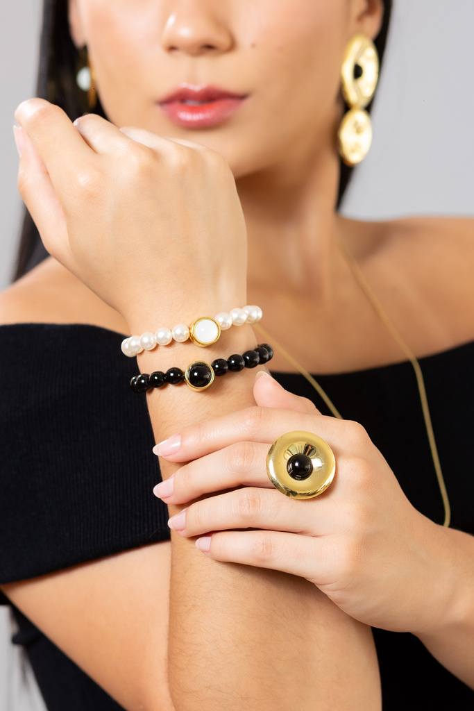 Anel médio regulável com chapa redonda no banho de ouro e pedra acrílica na cor preta. *Consulte a aba “dicas de conservação” ou vide a etiqueta afixada ao produto para ciência sobre os cuidados com a peça.