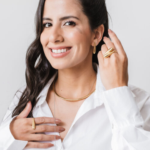 Anel regulável no banho de ouro e base gota. Consulte a aba “dicas de conservação” ou vide a etiqueta afixada ao produto para ciência sobre os cuidados com a peça.