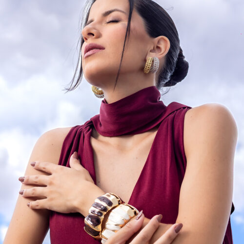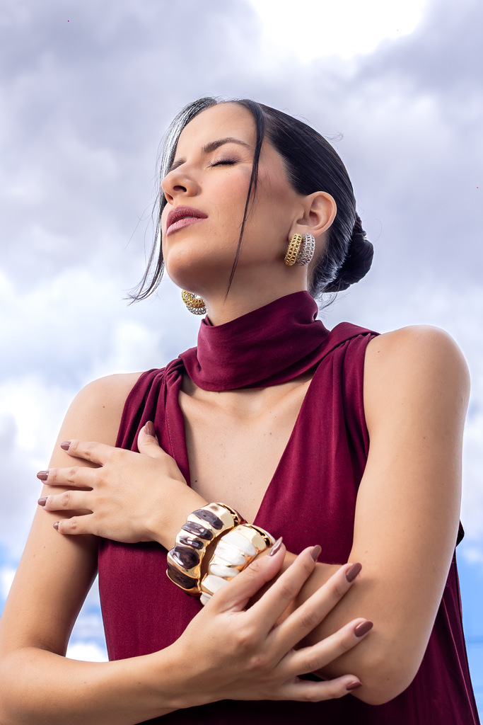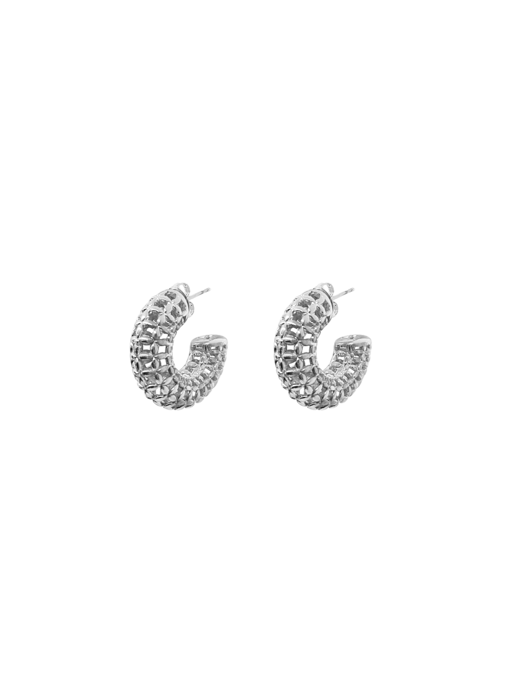 Brinco no banho diamante com design de trama vazada, textura trabalhada e acabamento polido, leve. *Consulte a aba “dicas de conservação” ou vide a etiqueta afixada ao produto para ciência sobre os cuidados com a peça.