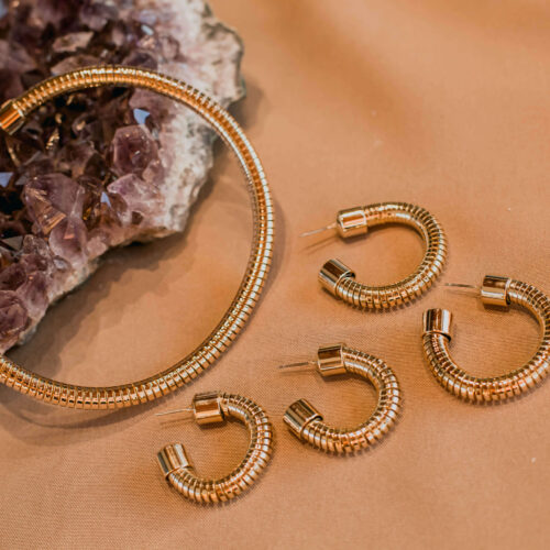 ARGOLA GRANDE COM FORMATO DE MOLA EM BANHO DE OURO, SUPER LEVE, POSSUI PINO ANTIALÉRGICO. *Consulte a aba “dicas de conservação” ou vide a etiqueta afixada ao produto para ciência sobre os cuidados com a peça