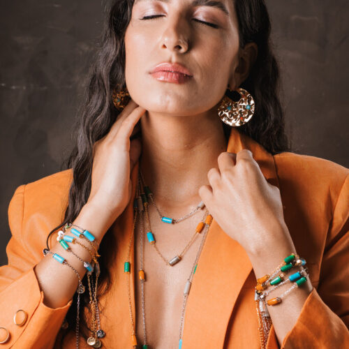 Voltar à LojaArgola chapa texturizada no banho de ouro e cristais coloridos.