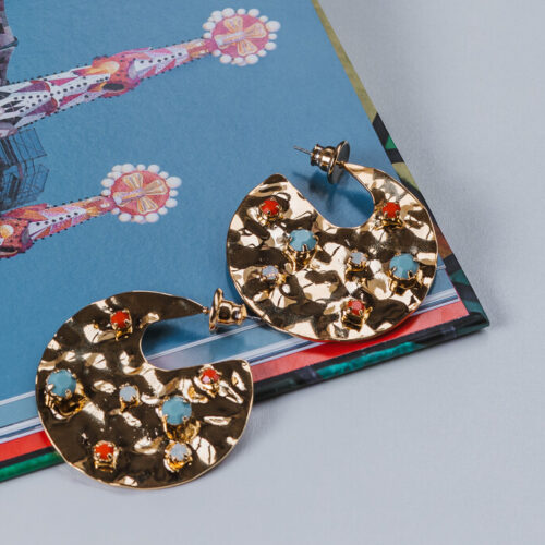 Brinco grande redondo em chapa texturizada no banho de ouro e detalhes com cristais coloridos, leve. Consulte a aba “dicas de conservação” ou vide a etiqueta afixada ao produto para ciência sobre os cuidados com a peça.