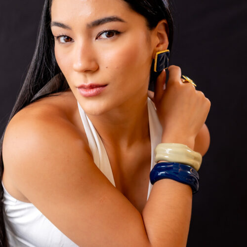 Bracelete grande de resina texturizada na cor bege. Consulte a aba “dicas de conservação” ou vide a etiqueta afixada ao produto para ciência sobre os cuidados com a peça.
