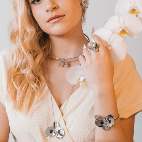 Bracelete em banho diamante com orquídea de tamanho grande. Possui leve regulagem. *Consulte a aba “dicas de conservação” ou vide a etiqueta afixada ao produto para ciência sobre os cuidados com a peça.