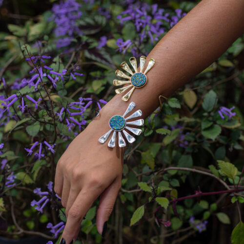 Voltar à LojaBracelete de flor no banho de ouro e drusa sintética azul.