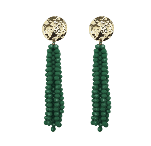 Brinco grande de franja em cristal verde e base redonda texturizada no banho de ouro, super leve. *Consulte a aba “dicas de conservação” ou vide a etiqueta afixada ao produto para ciência sobre os cuidados com a peça.