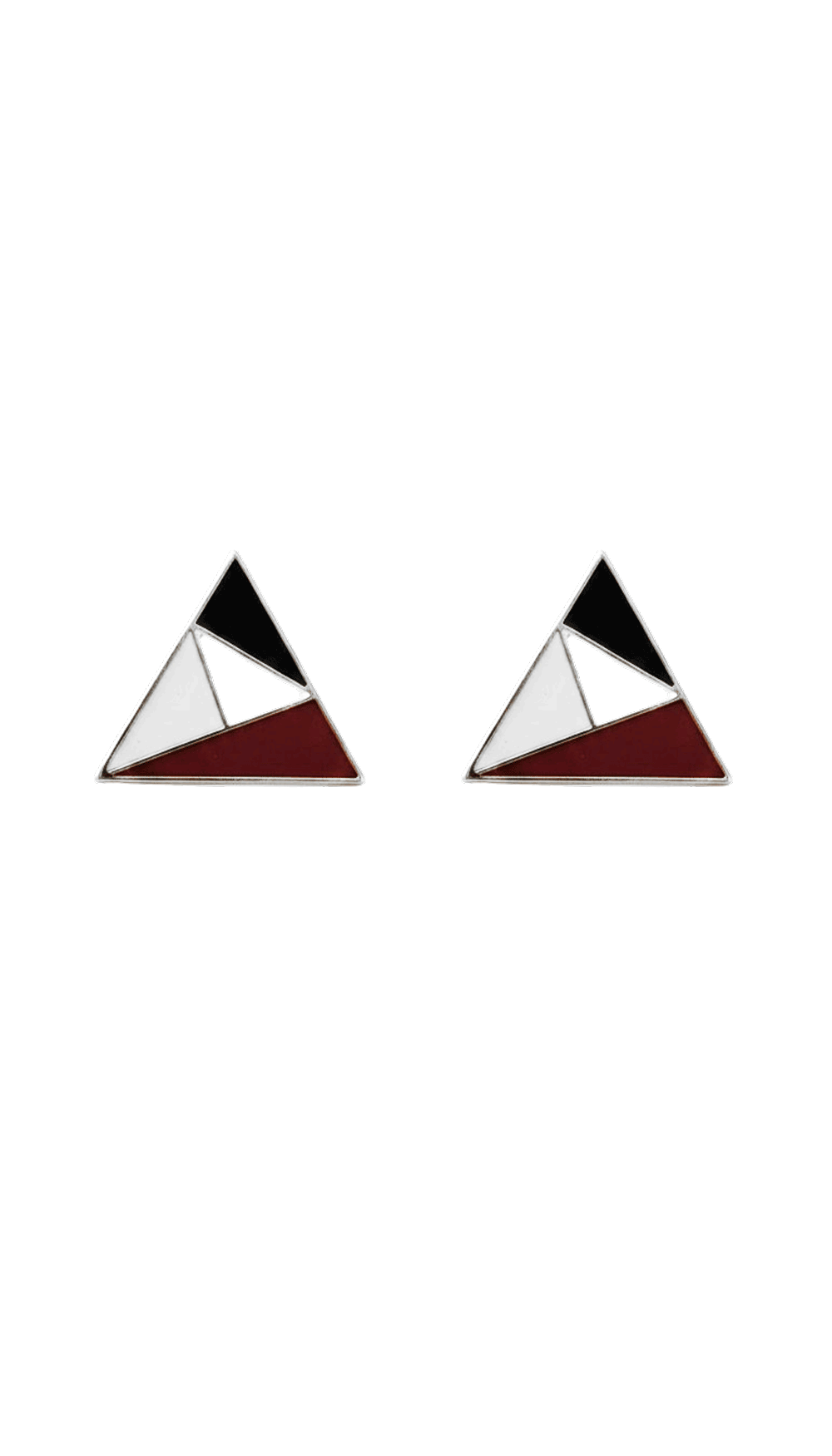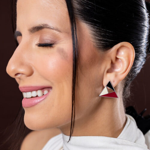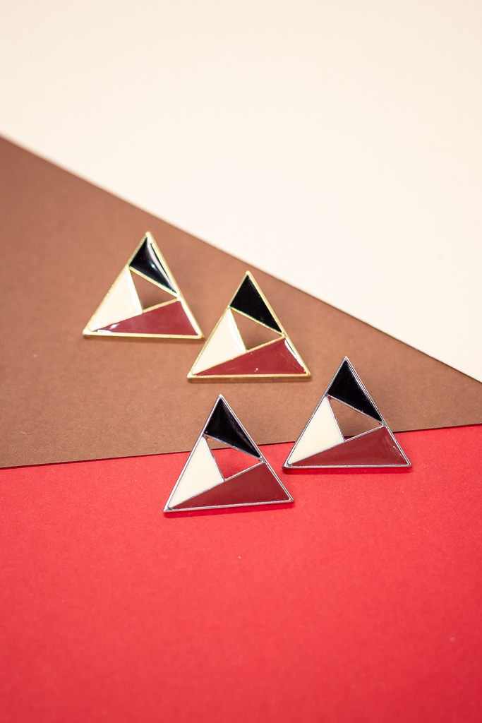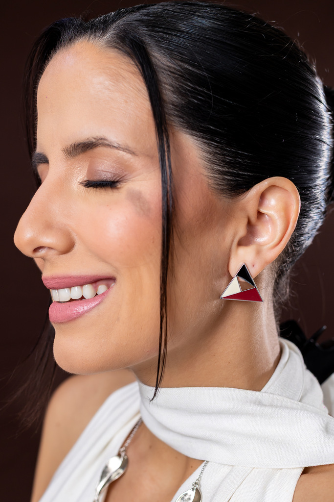 Brinco com base triangular no banho diamante e esmaltação em três cores, design moderno com acabamento polido, leve. *Consulte a aba “dicas de conservação” ou vide a etiqueta afixada ao produto para ciência sobre os cuidados com a peça.