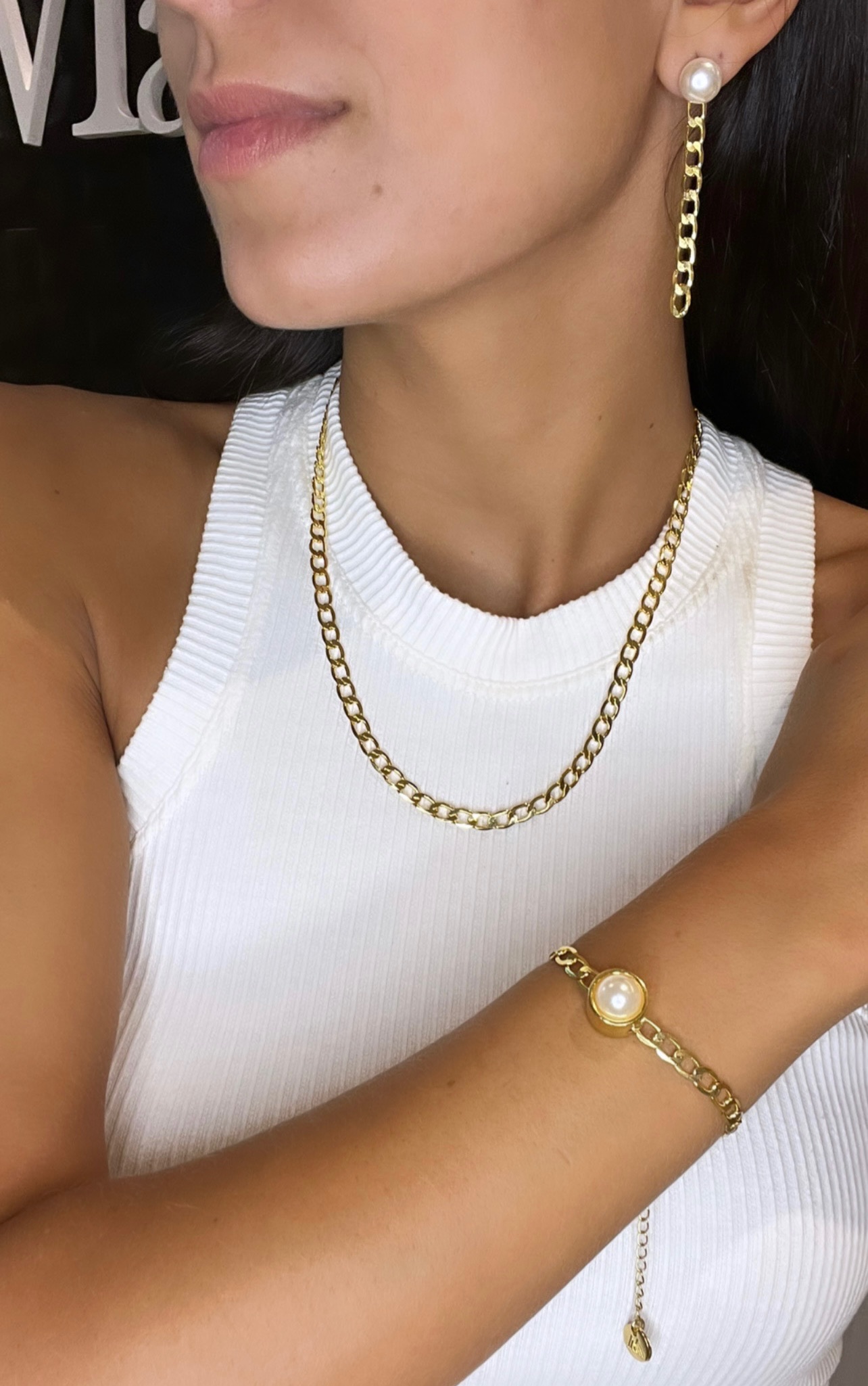 Brinco 2 em 1 com pérola e corrente no banho de ouro, super leve. *Consulte a aba “dicas de conservação” ou vide a etiqueta afixada ao produto para ciência sobre os cuidados com a peça.