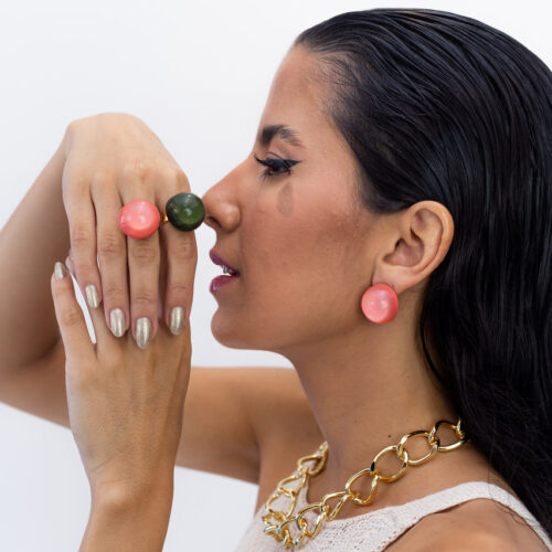 Brinco médio de bola em resina rosa, super leve. Consulte a aba “dicas de conservação” ou vide a etiqueta afixada ao produto para ciência sobre os cuidados com a peça.