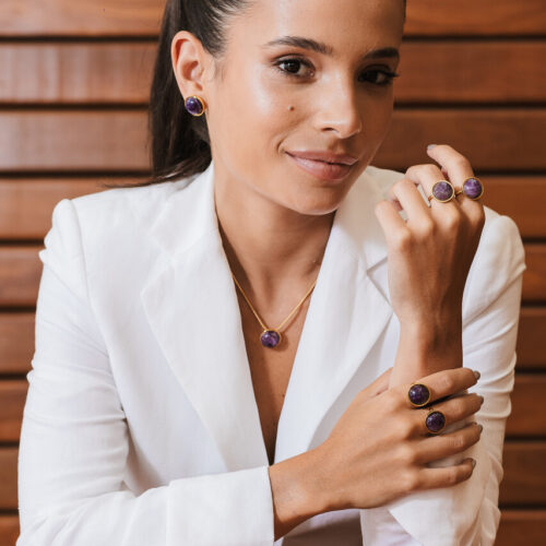 Brinco botão pequeno em banho de ouro e pedra Ametista, super leve. Por se tratar de um produto com materiais naturais, as peças podem sofrer diferenças de tonalidades. Consulte a aba “dicas de conservação” ou vide a etiqueta afixada ao produto para ciência sobre os cuidados com a peça.