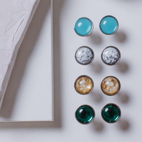 Brinco botão pequeno em banho diamante e resina branca mesclada com preto, super leve. Consulte a aba “dicas de conservação” ou vide a etiqueta afixada ao produto para ciência sobre os cuidados com a peça.