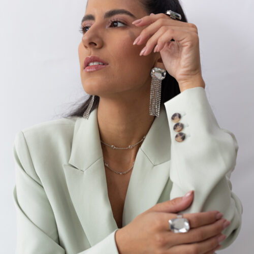 Brinco grande com resina translúcida branca e franja de corrente de cristal em banho diamante, super leve. *Consulte a aba “dicas de conservação” ou vide a etiqueta afixada ao produto para ciência sobre os cuidados com a peça.