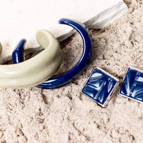 Brinco médio no banho diamante de formato quadrado com bordas texturizadas e resina texturizada na cor azul marinho, leve. *Consulte a aba “dicas de conservação” ou vide a etiqueta afixada ao produto para ciência sobre os cuidados com a peça.