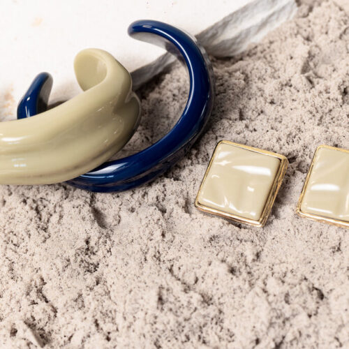Brinco médio no banho diamante de formato quadrado com bordas texturizadas e resina texturizada na cor bege, leve. *Consulte a aba “dicas de conservação” ou vide a etiqueta afixada ao produto para ciência sobre os cuidados com a peça.
