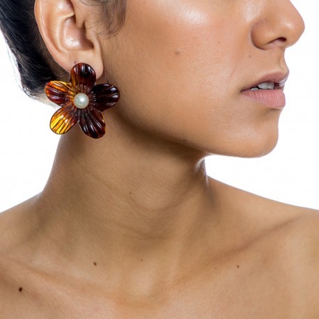 Brinco médio de flor de resina tartaruga com pérola, super leve. Consulte a aba “dicas de conservação” ou vide a etiqueta afixada ao produto para ciência sobre os cuidados com a peça.