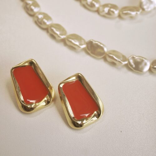 Brinco pequeno de formato retangular no banho de ouro, bordas detalhadas e esmaltação na cor laranja, super leve. *Consulte a aba “dicas de conservação” ou vide a etiqueta afixada ao produto para ciência sobre os cuidados com a peça