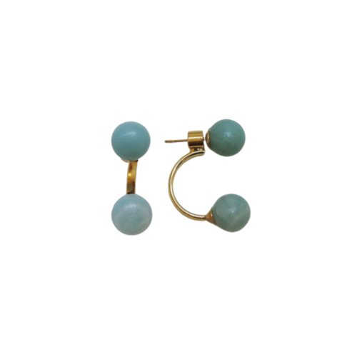 Brinco médio 2 em 1 no banho de ouro e pedra natural Amazonita, super leve. Por se tratar de um produto com materiais naturais, as peças podem sofrer diferenças de tonalidades.*Consulte a aba “dicas de conservação” ou vide a etiqueta afixada ao produto para ciência sobre os cuidados com a peça.