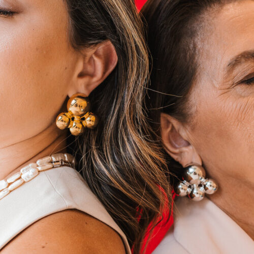 Brinco grande com bolas no banho de ouro. *Consulte a aba “dicas de conservação” ou vide a etiqueta afixada ao produto para ciência sobre os cuidados com a peça.