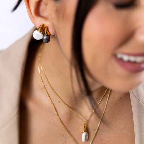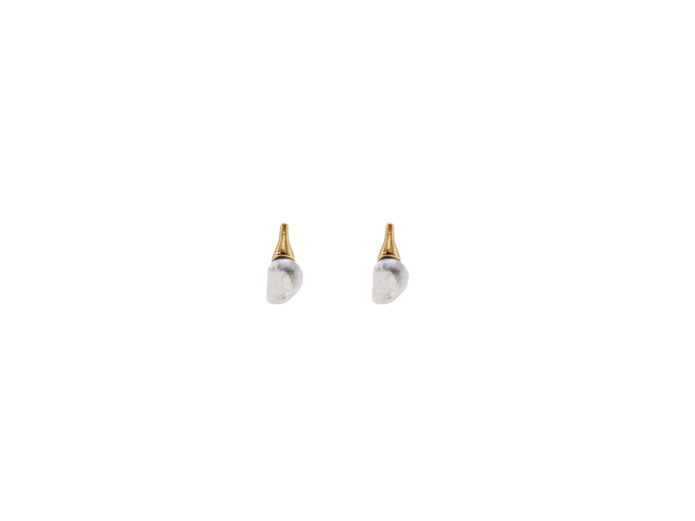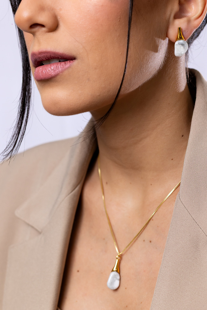 Brinco com base em pino orgânico no banho de ouro e pedra natural Howlita, design orgânico com acabamento polido, leve. *Consulte a aba “dicas de conservação” ou vide a etiqueta afixada ao produto para ciência sobre os cuidados com a peça.