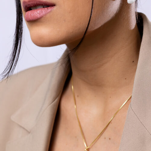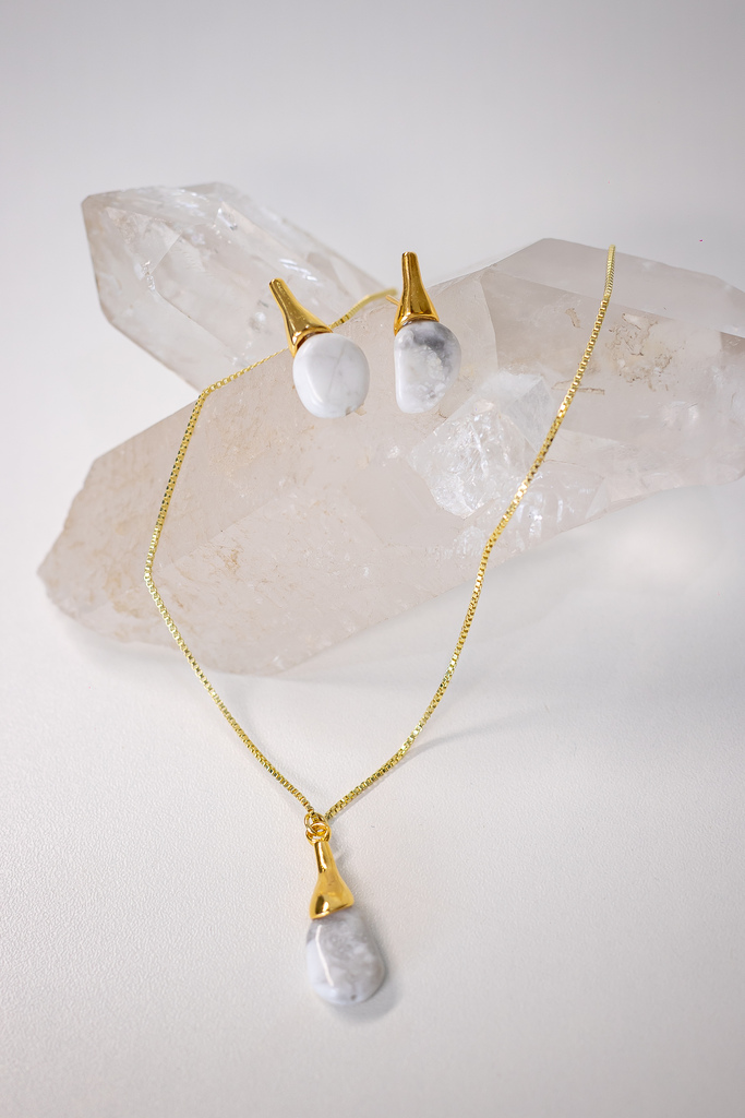 Voltar à LojaBrinco com pedra natural Howlita e base orgânico no banho de ouro