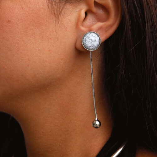 Brinco botão grande com corrente no banho diamante e resina branca mesclada com preto, super leve. Consulte a aba “dicas de conservação” ou vide a etiqueta afixada ao produto para ciência sobre os cuidados com a peça.
