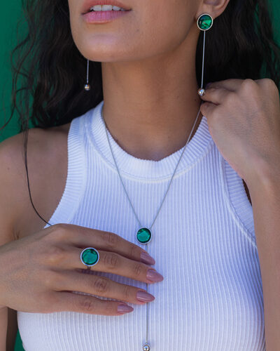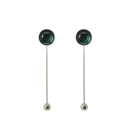 Brinco botão longo com corrente no banho diamante e resina verde.