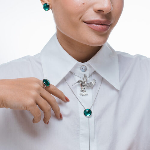 Brinco botão grande com corrente no banho diamante e resina verde, super leve. Consulte a aba “dicas de conservação” ou vide a etiqueta afixada ao produto para ciência sobre os cuidados com a peça.