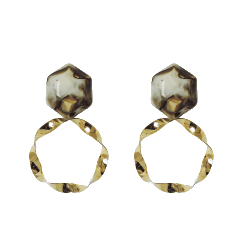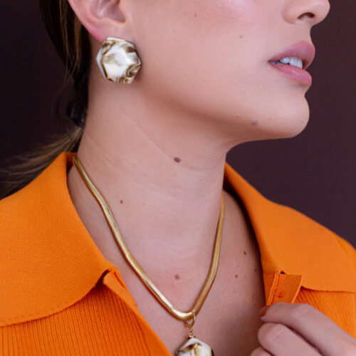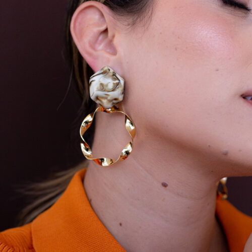 Brinco grande hexagonal de resina nude mesclada e argola no banho de ouro, super leve. As peças podem sofrer diferenças de tonalidades. Consulte a aba “dicas de conservação” ou vide a etiqueta afixada ao produto para ciência sobre os cuidados com a peça.