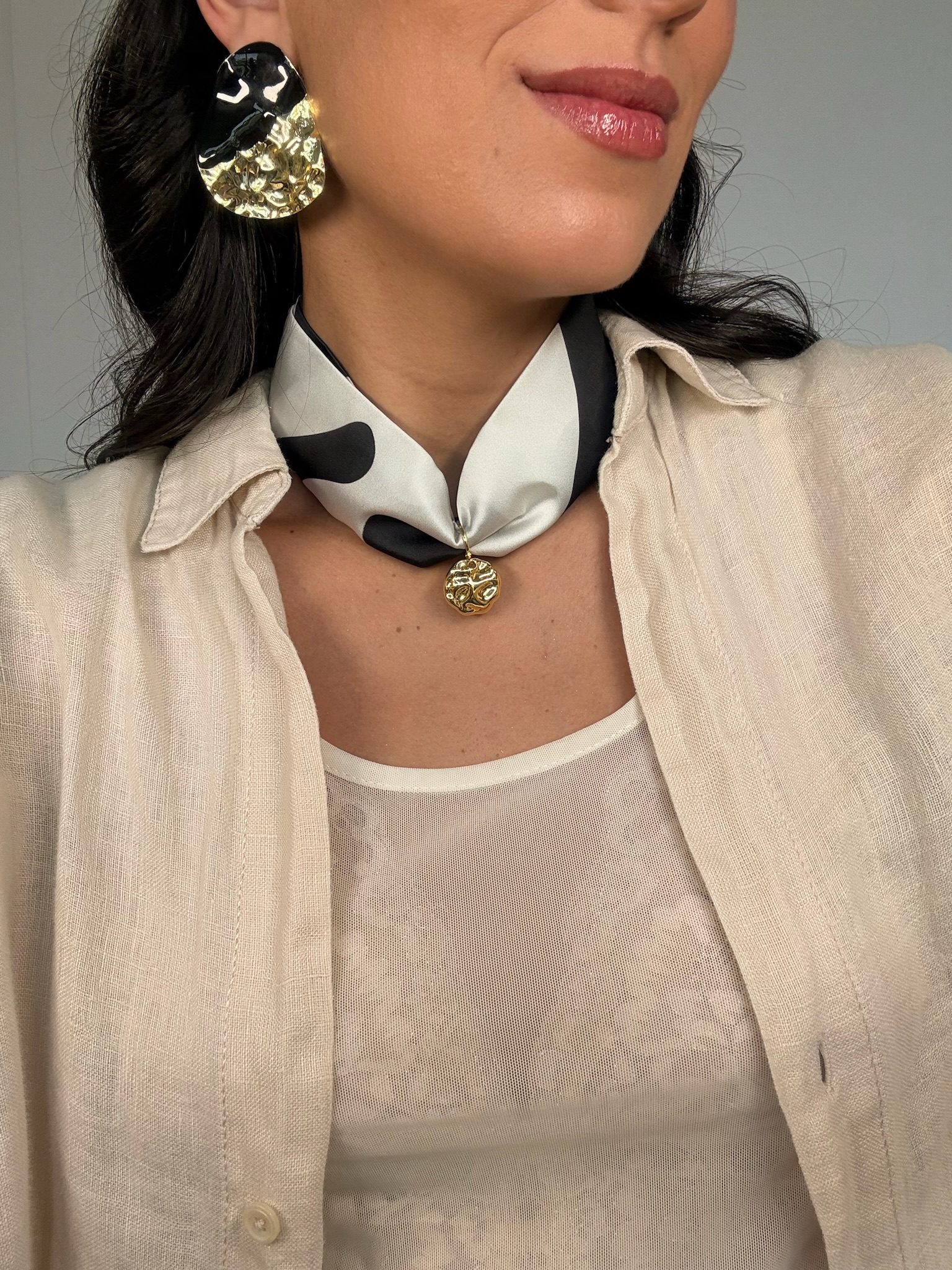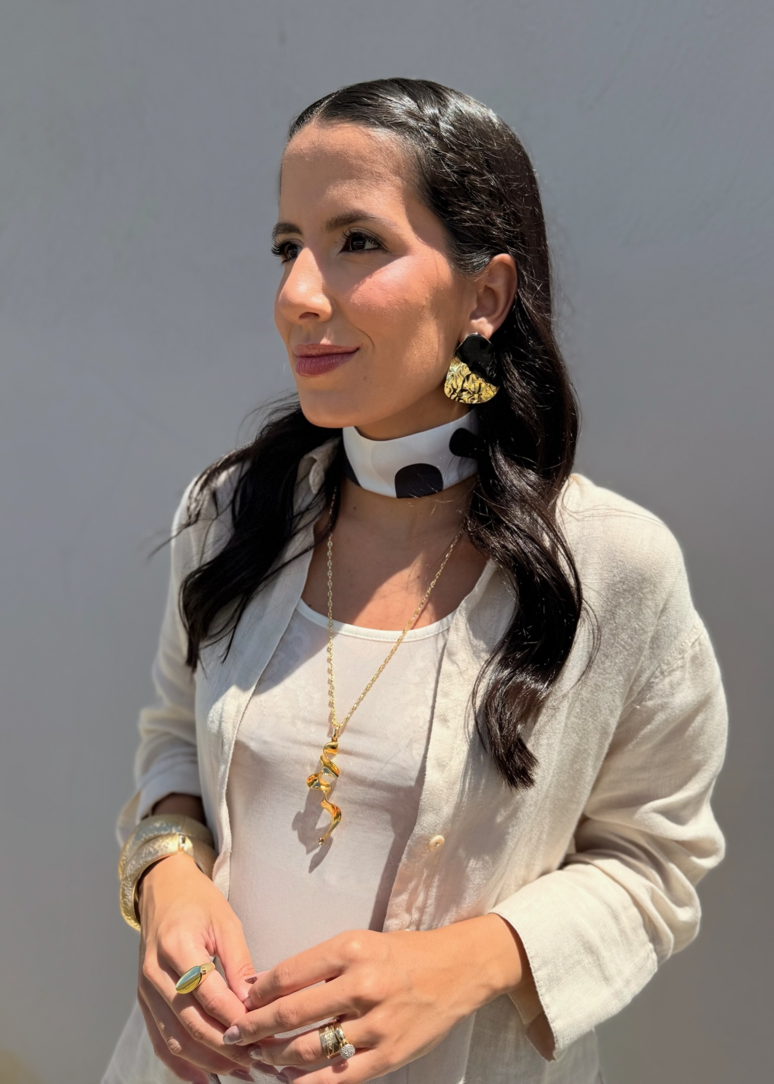 Brinco grande de chapa orgânica oval texturizada no banho de ouro com esmaltação na cor preta, super leve. *Consulte a aba “dicas de conservação” ou vide a etiqueta afixada ao produto para ciência sobre os cuidados com a peça.