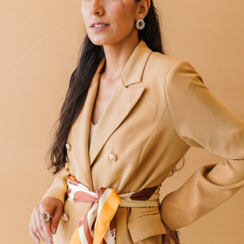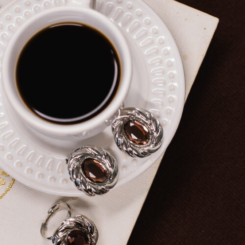 Brinco pequeno de formato redondo com borda detalhada no banho diamante e resina acrílica marrom, leve. *Consulte a aba “dicas de conservação” ou vide a etiqueta afixada ao produto para ciência sobre os cuidados com a peça.