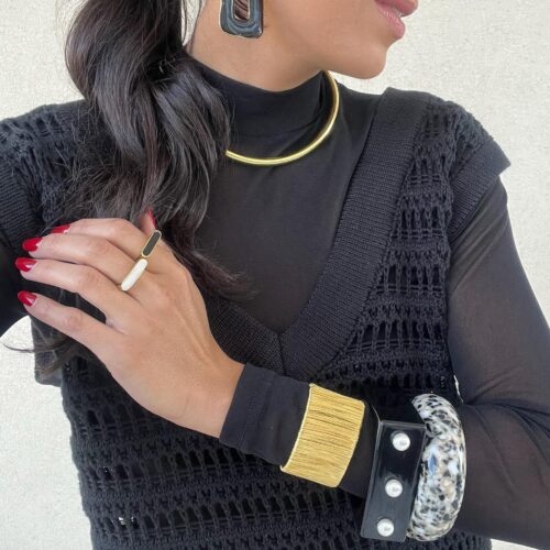 Brinco grande de formato retangular no banho de ouro e esmaltação na cor preta e perolada, super leve. *Consulte a aba “dicas de conservação” ou vide a etiqueta afixada ao produto para ciência sobre os cuidados com a peça.