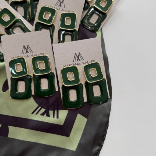 Brinco grande de formato retangular no banho de ouro e esmaltação na cor verde militar, super leve. *Consulte a aba “dicas de conservação” ou vide a etiqueta afixada ao produto para ciência sobre os cuidados com a peça.