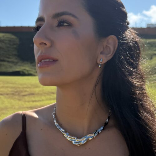 Brinco pequeno com formato orgânico alongado no banho diamante, super leve. *Consulte a aba “dicas de conservação” ou vide a etiqueta afixada ao produto para ciência sobre os cuidados com a peça.