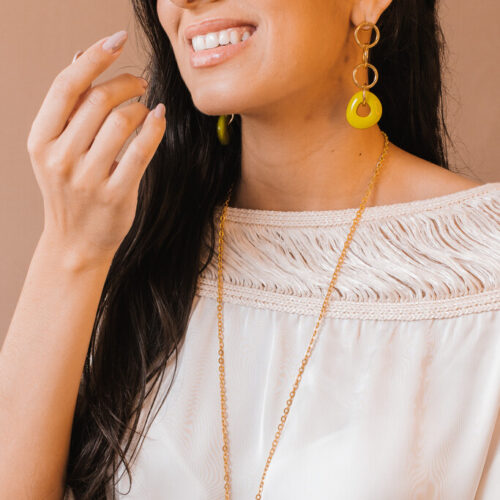 Brinco grande com corrente de elos redondos no banho de ouro e resina com formato orgânico na cor verde, super leve. Consulte a aba “dicas de conservação” ou vide a etiqueta afixada ao produto para ciência sobre os cuidados com a peça.