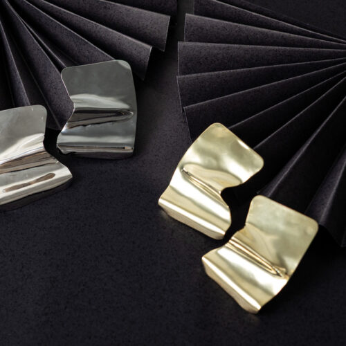 Brinco grande de chapa retangular texturizada no banho de ouro, super leve. *Consulte a aba “dicas de conservação” ou vide a etiqueta afixada ao produto para ciência sobre os cuidados com a peça.