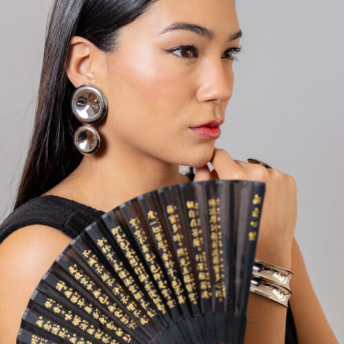 Brinco grande 2 em 1 de chapa redonda no banho diamante, super leve. *Consulte a aba “dicas de conservação” ou vide a etiqueta afixada ao produto para ciência sobre os cuidados com a peça.