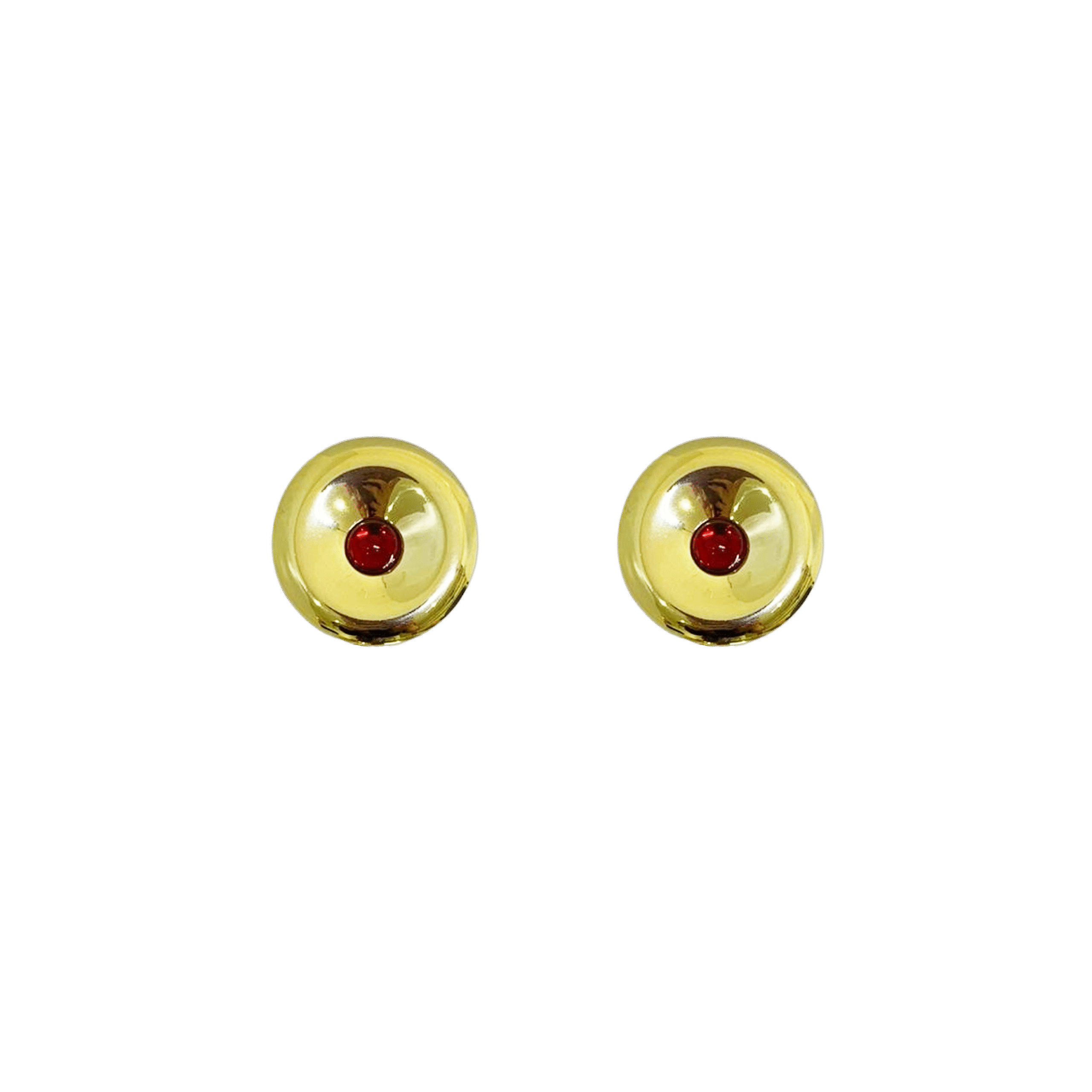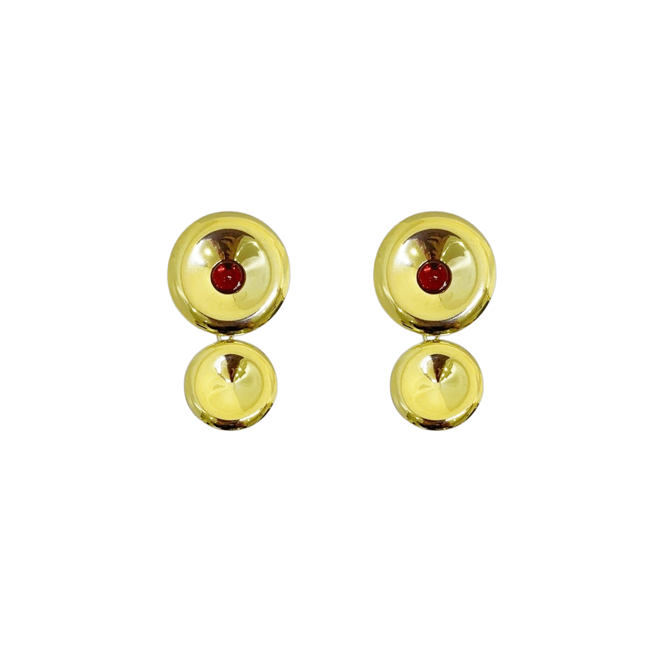 Brinco 2 em 1 redondo com pedra acrílica vinho e banho de ouro.