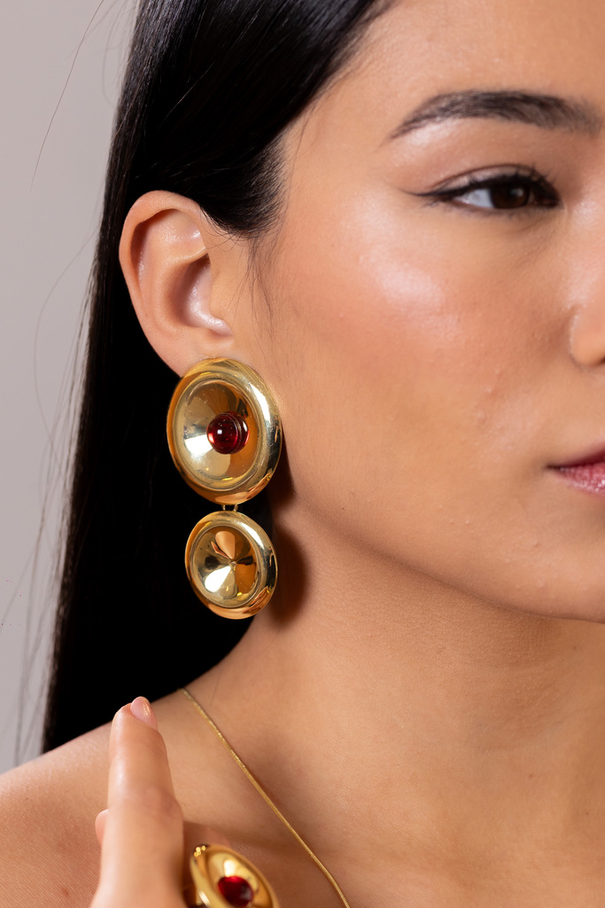 Brinco grande 2 em 1 de chapa redonda no banho de ouro e pedra acrílica na cor vinho, super leve. *Consulte a aba “dicas de conservação” ou vide a etiqueta afixada ao produto para ciência sobre os cuidados com a peça.