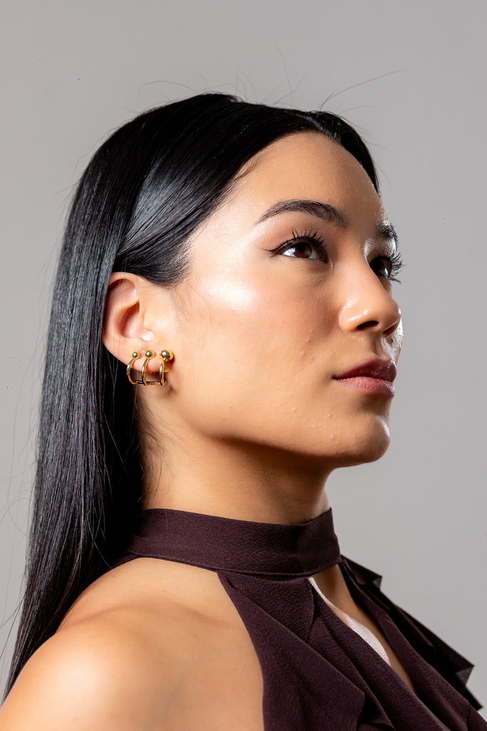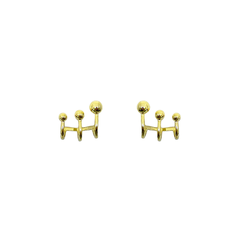 Brinco médio com formato espiral e bolas no banho de ouro, super leve. *Consulte a aba “dicas de conservação” ou vide a etiqueta afixada ao produto para ciência sobre os cuidados com a peça.