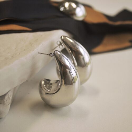Argola média com formato de gota no banho diamante, super leve. *Consulte a aba “dicas de conservação” ou vide a etiqueta afixada ao produto para ciência sobre os cuidados com a peça