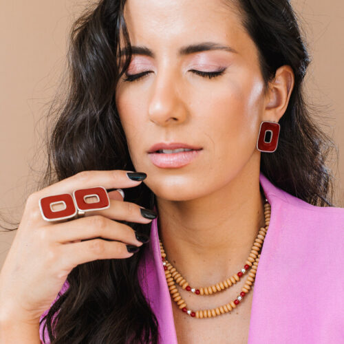 Voltar à LojaColar nude com detalhes vermelhos e banho diamante.