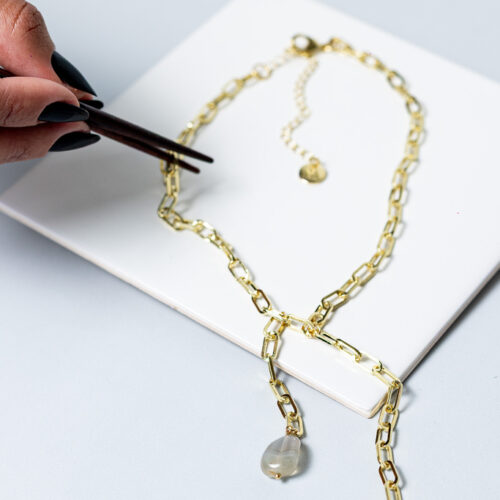 Colar longo com corrente estilo cartier, pedra natural Ágata e pingente com formato de gota no banho de ouro. Possui extensor de 10cm. *Consulte a aba “dicas de conservação” ou vide a etiqueta afixada ao produto para ciência sobre os cuidados com a peça.