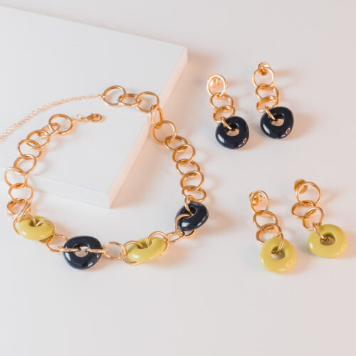 Colar curto com correntes em elos redondos no banho de ouro e resinas de formato orgânico nas cores azul marinho e verde. Possui extensor de 10cm.*Consulte a aba “dicas de conservação” ou vide a etiqueta afixada ao produto para ciência sobre os cuidados com a peça.