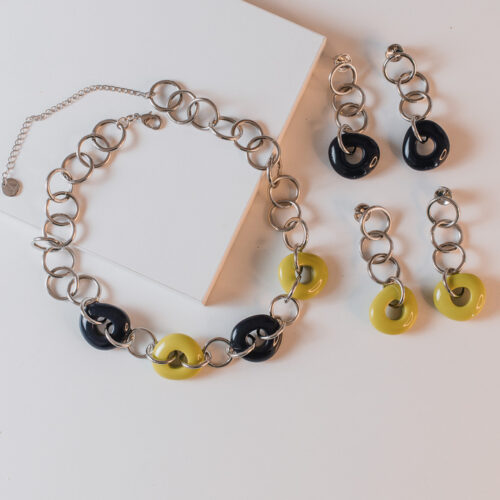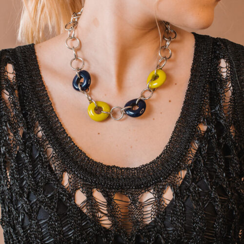 Colar curto com correntes em elos redondos no banho diamante e resinas de formato orgânico nas cores azul marinho e verde. Possui extensor de 10cm.*Consulte a aba “dicas de conservação” ou vide a etiqueta afixada ao produto para ciência sobre os cuidados com a peça.