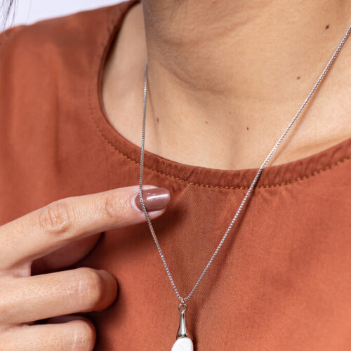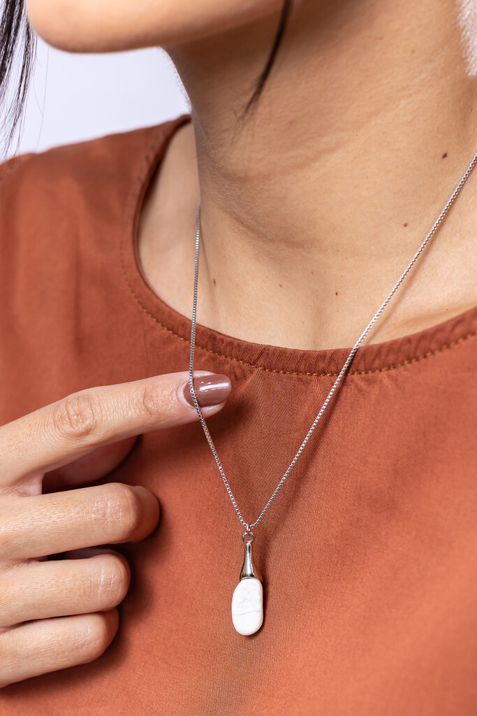Colar com base em pino orgânico no banho diamante e pedra natural Howlita, design orgânico com acabamento polido. Possui extensor de 10cm. *Consulte a aba “dicas de conservação” ou vide a etiqueta afixada ao produto para ciência sobre os cuidados com a peça.